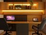 • Sala de estar com painel ripado em madeira e iluminação embutida, criando um ambiente acolhedor e sofisticado.