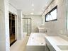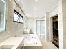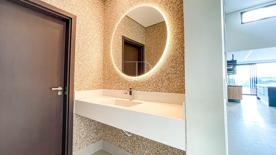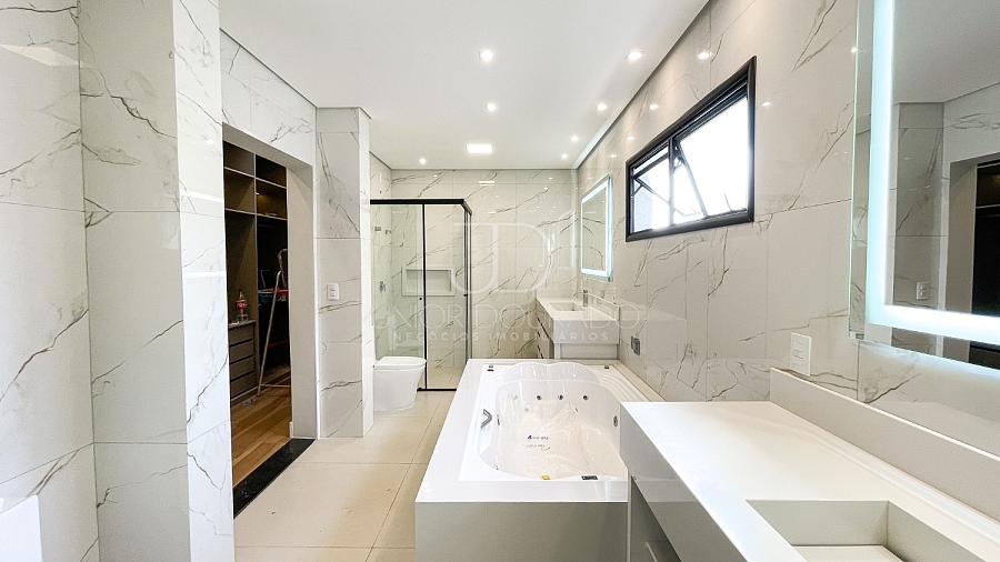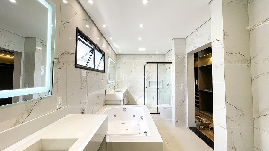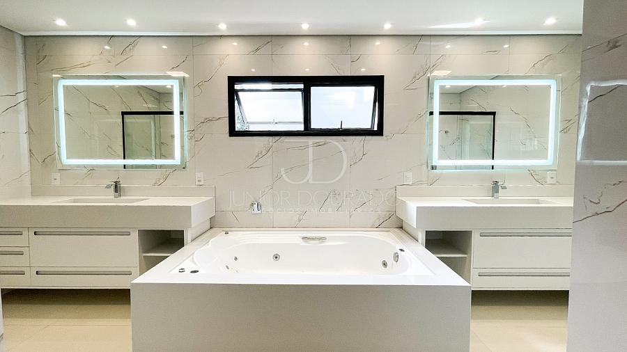• Banheiro da suíte master com conceito “duplo”, pias e vasos sanitários individuais, boxes individuais e banheira de hidromassagem e espelhos tipo camarim com iluminação em LED.