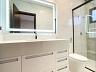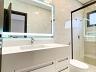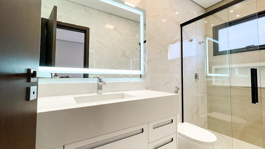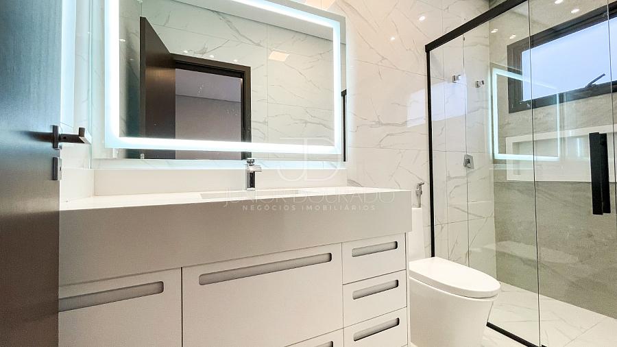 • Banheiro de todas as suítes com gabinetes em MDF branco / pias esculpidas em branco prime / espelhos tipo camarim com iluminação em LED / box em vidro temperado.