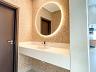 • Lavabo com pia esculpida em pedra branco prime e espelho com iluminação.