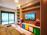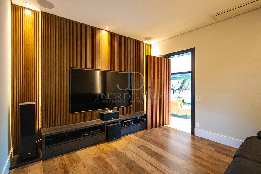 • Cinema com sofa eletrico em couro natuzzi todo com marcenaria ripado e com sistema de som dolb atmos e tv 4k qled sansung de 85 polegadas.
