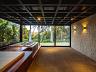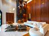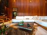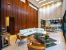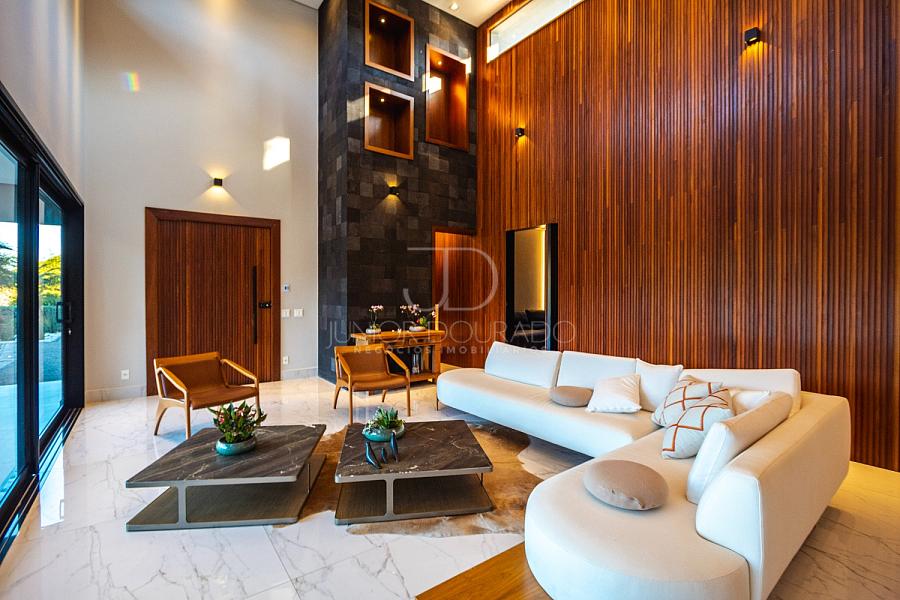 • A ampla sala com pé direito de 7 metros cria uma atmosfera de amplitude e grandiosidade com madeira e pedra natural sem perder o aconchego e a elegância.